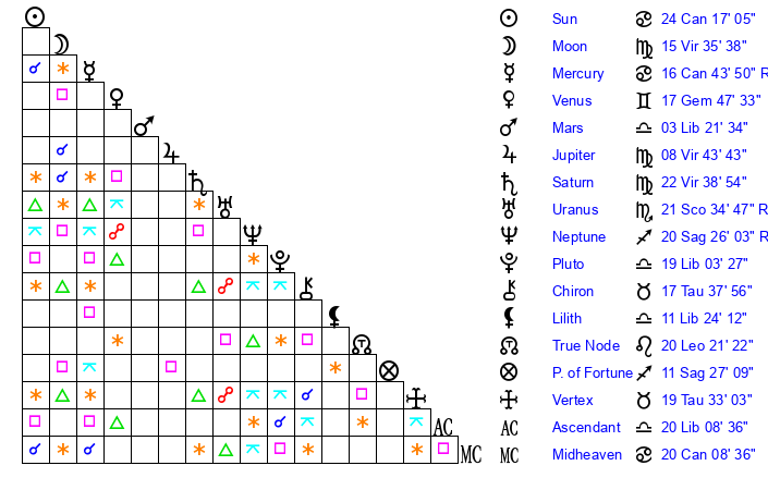 | Sun | 24 Cancer 17 | 24 Cancer 25 | 7 Virgo 27 |