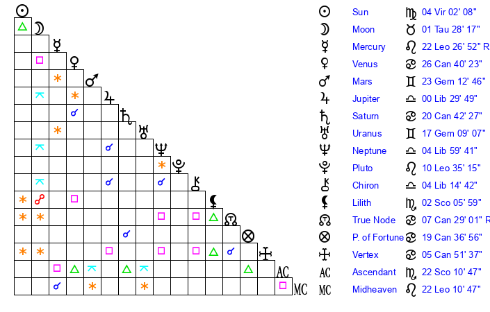 | Mercury | 22 Leo 27 | 19 Leo 21 | 15 Sagittarius 7 |