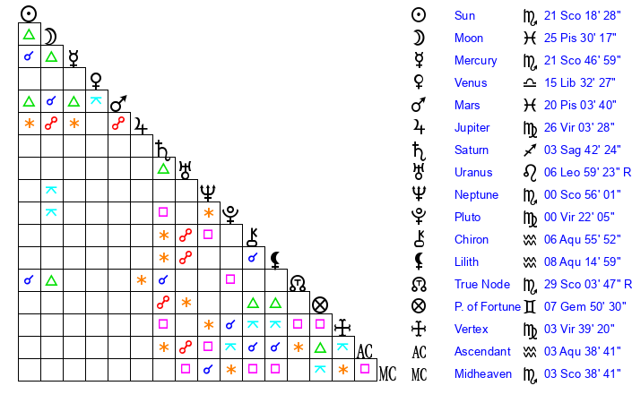 | Neptune | 0 Scorpio 56 | 29 Pisces 33 | 2 Scorpio 33 |