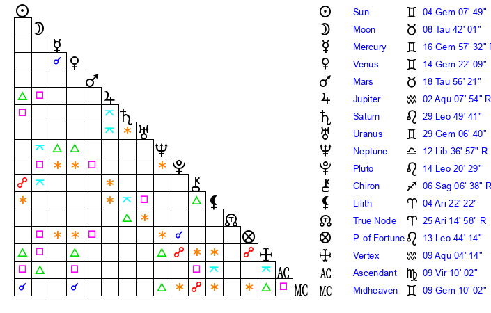 | Venus | 14 Gemini 23 | 19 Aries 2 | 17 Virgo 0 |