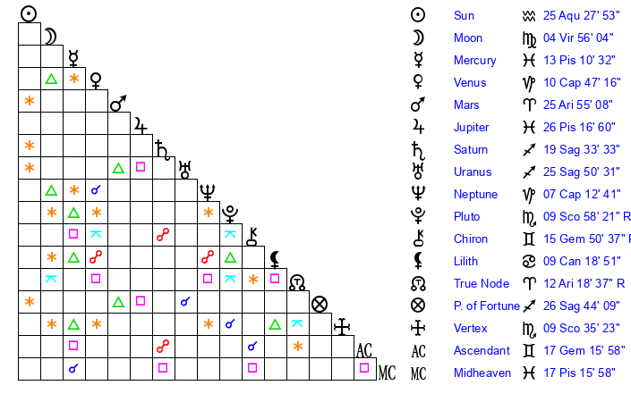 | Moon | 5 Virgo 0 | 20 Virgo 25 | 0 Aquarius 29 |