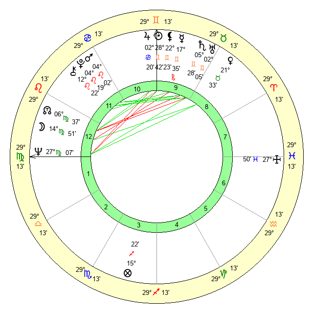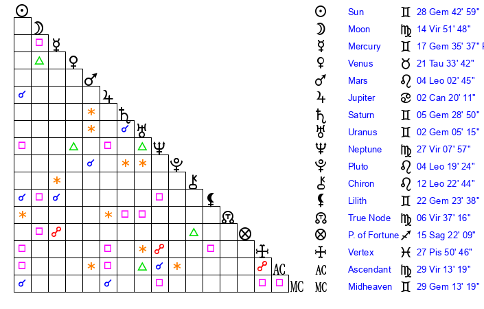 | Sun | 28 Gemini 43 | 29 Gemini 37 | 18 Virgo 19 |