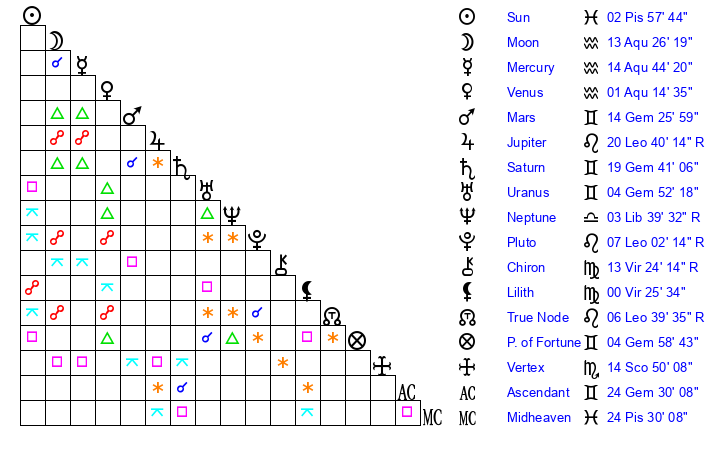 | Mercury | 14 Aquarius 45 | 15 Pisces 11 | 6 Taurus 57 |