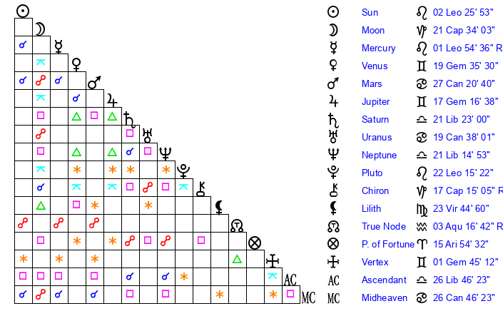 Moon | 21 Capricorn 33 | 14 Leo 26 | 16 Virgo 55 |