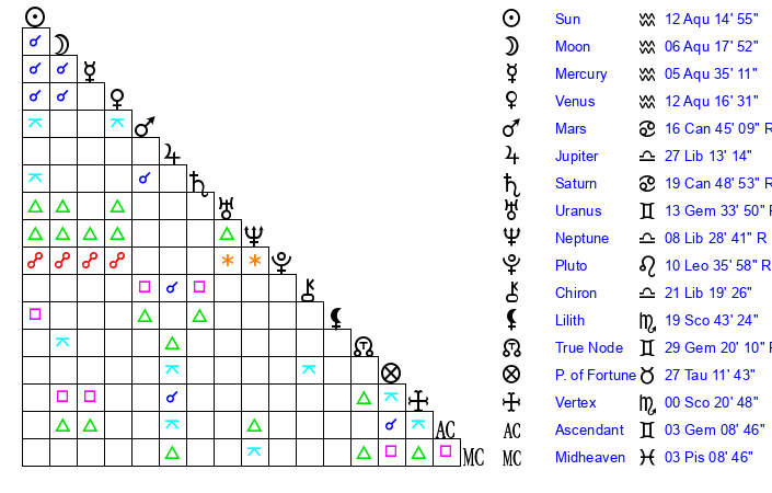 | Moon | 6 Aquarius 20 | 25 Pisces 0 | 28 Sagittarius 8 |