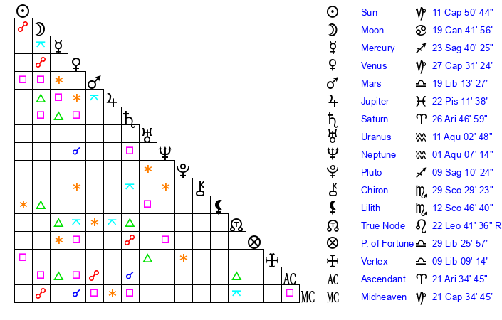 | Moon | 19 Cancer 41 | 17 Aquarius 5 | 0 Cancer 9 |