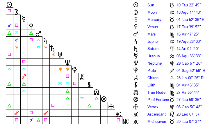 | Uranus | 8 Aquarius 37 | 26 Taurus 19 | 8 Aquarius 35 |
