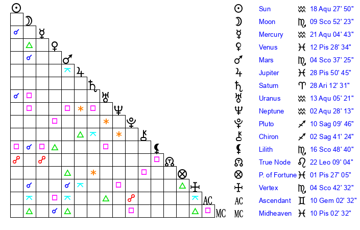 | Sun | 18 Aquarius 28 | 19 Aquarius 10 | 14 Pisces 40 |