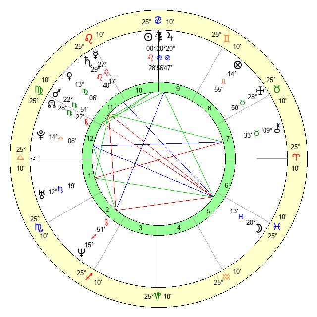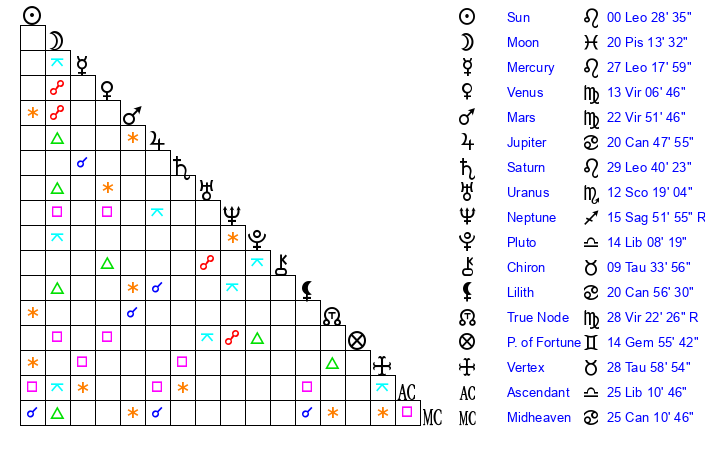 | Moon | 20 Pisces 11 | 16 Cancer 48 | 27 Scorpio 19 |