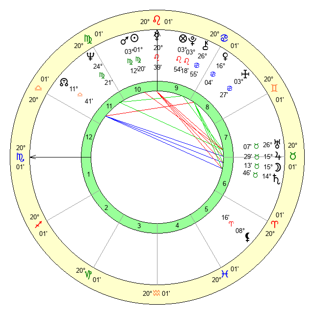 | Moon | 15 Taurus 7 | 18 Virgo 54 | 24 Gemini 50 |
