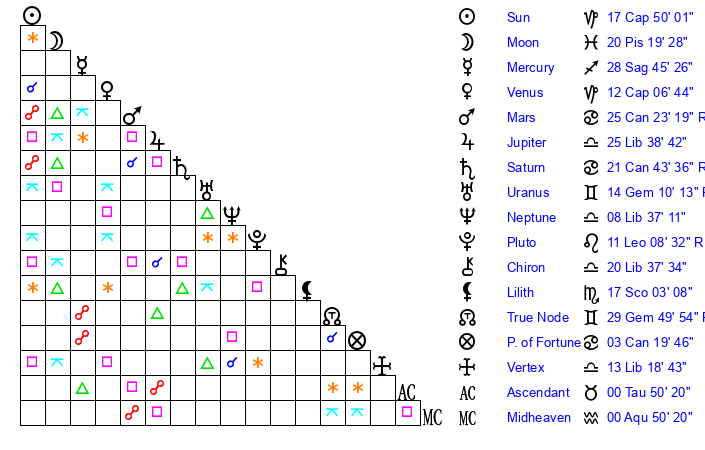 | Sun | 17 Capricorn 50 | 18 Capricorn 40 | 7 Aries 25 |