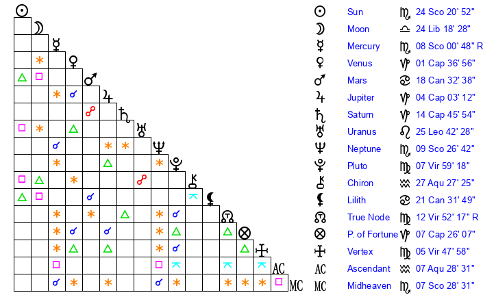 | Moon | 24 Libra 18 | 15 Libra 38 | 23 Pisces 9 |
