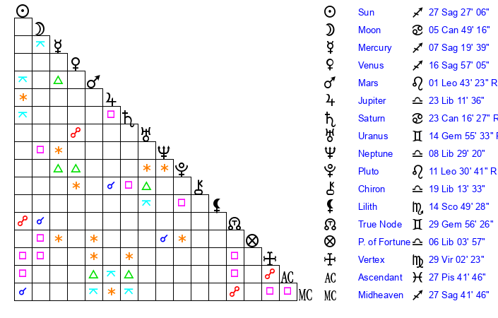 | Moon | 5 Cancer 50 | 24 Sagittarius 4 | 8 Gemini 11 |