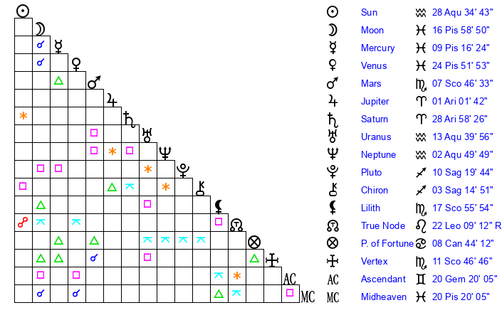 | Moon | 16 Pisces 58 | 26 Libra 16 | 27 Aquarius 24 |