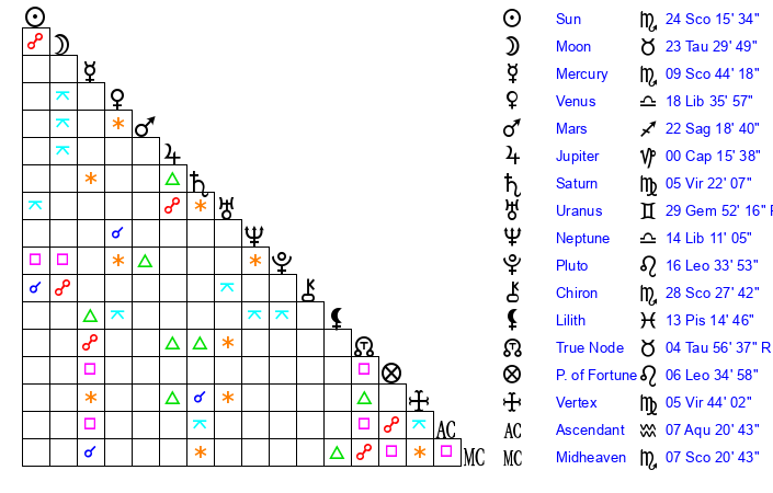 | Sun | 24 Scorpio 16 | 24 Scorpio 35 | 12 Aquarius 32 |