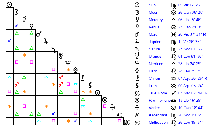 | Sun | 9 Virgo 12 | 9 Virgo 30 | 17 Scorpio 16 |