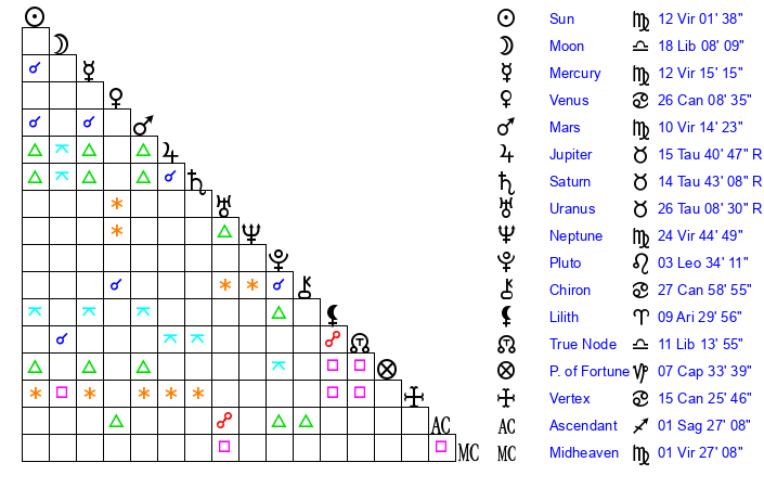 | Neptune | 24 Virgo 45 | 1 Aries 15 | 27 Virgo 26 |