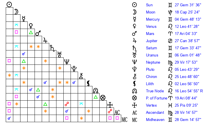 | Saturn | 17 Gemini 50 | 1 Aries 22 | 26 Gemini 8 |
