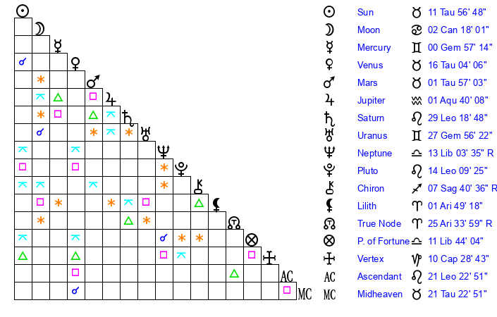 | Sun | 11 Taurus 57 | 12 Taurus 32 | 24 Cancer 45 |