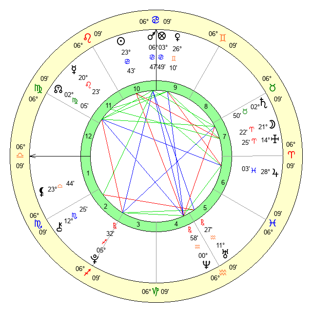 | Mars | 6 Cancer 47 | 16 Virgo 52 | 24 Cancer 36 |