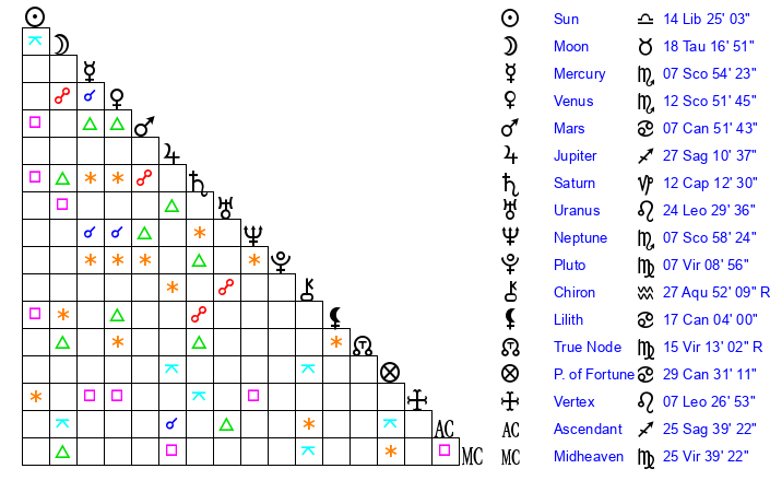 | Sun | 14 Libra 25 | 14 Libra 41 | 19 Sagittarius 41 |
