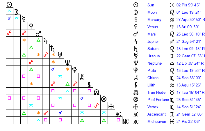 | Pluto | 13 Leo 19 | 2 Aquarius 42 | 12 Leo 35 |