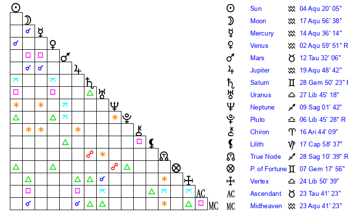 | Sun | 4 Aquarius 20 | 4 Aquarius 58 | 25 Pisces 43 |