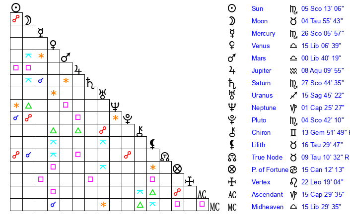 | Moon | 4 Taurus 55 | 24 Capricorn 21 | 15 Libra 38 |