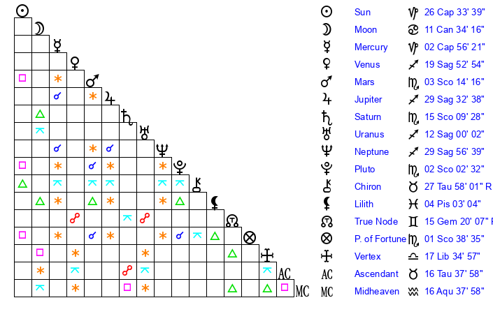 | Moon | 11 Cancer 36 | 9 Virgo 56 | 21 Capricorn 20 |