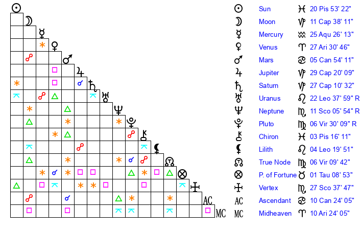 | Jupiter | 29 Capricorn 12 | 13 Gemini 17 | 6 Aquarius 47 |