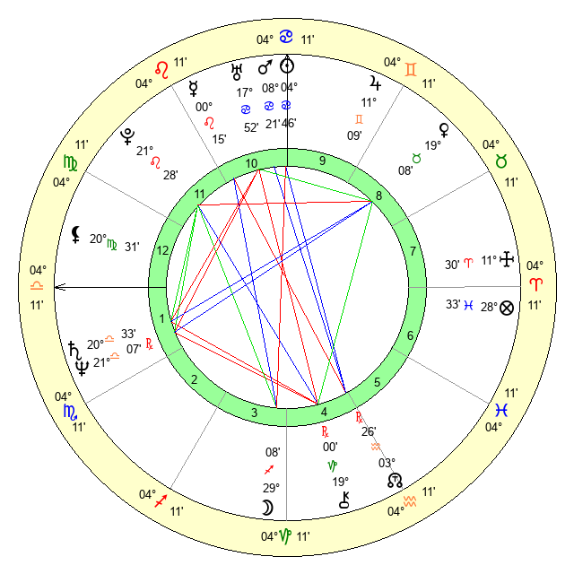 | Sun | 4 Cancer 46 | 5 Cancer 20 | 13 Virgo 47 |