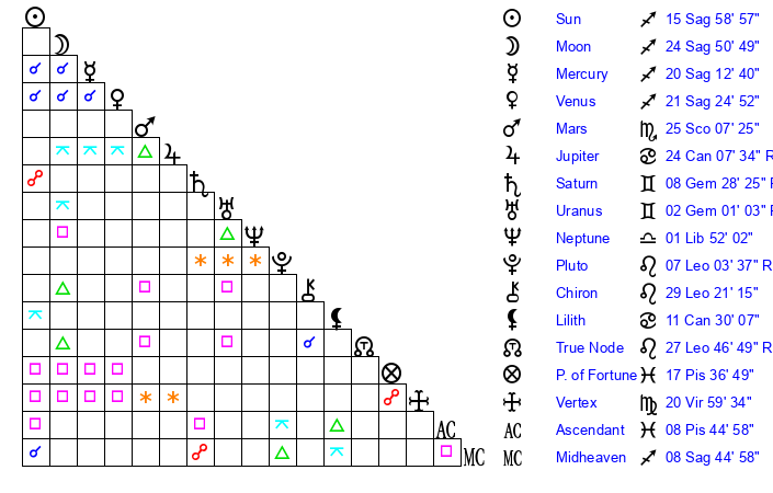 | Sun | 15 Sagittarius 59 | 16 Sagittarius 51 | 10 Pisces 15 |