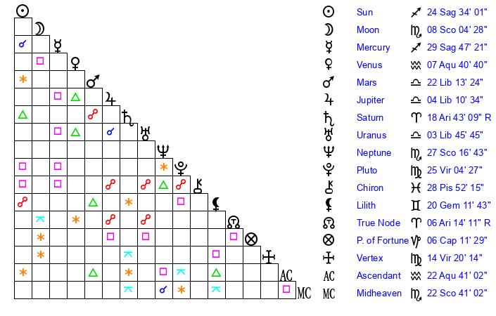 | Neptune | 27 Scorpio 17 | 27 Pisces 8 | 28 Scorpio 37 |