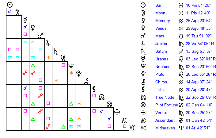 | Sun | 10 Pisces 51 | 11 Pisces 22 | 17 Taurus 49 |