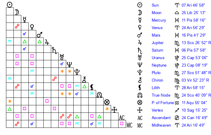 | Moon | 25 Libra 19 | 27 Pisces 47 | 18 Sagittarius 31 |