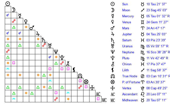 | Moon | 23 Sagittarius 39 | 21 Gemini 21 | 12 Pisces 36 |