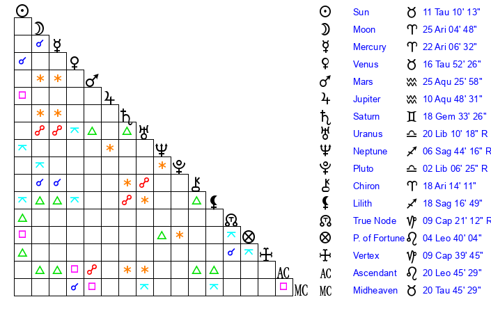 | Sun | 11 Taurus 10 | 11 Taurus 34 | 1 Cancer 6 |