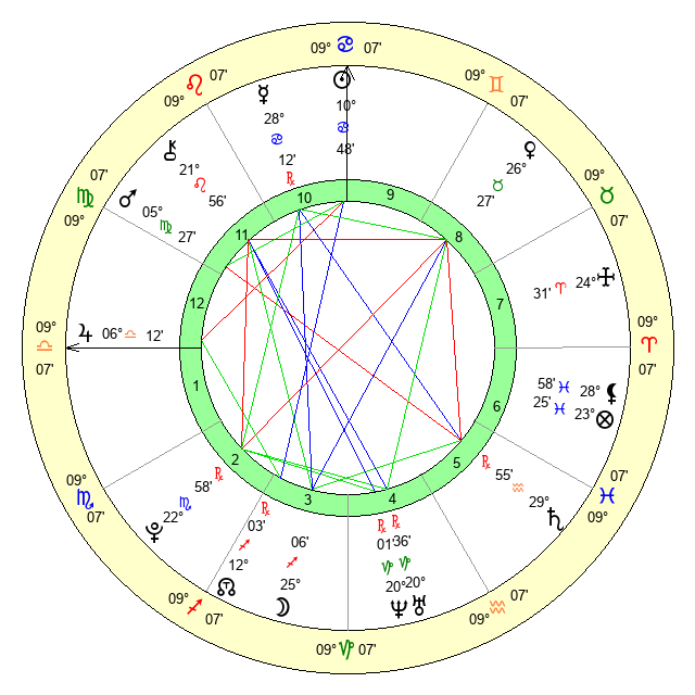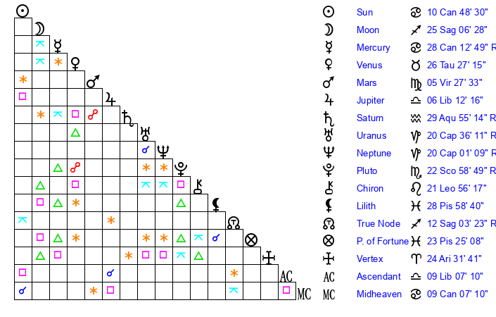 | Mercury | 28 Cancer 12 | 6 Leo 56 | 22 Cancer 6 |