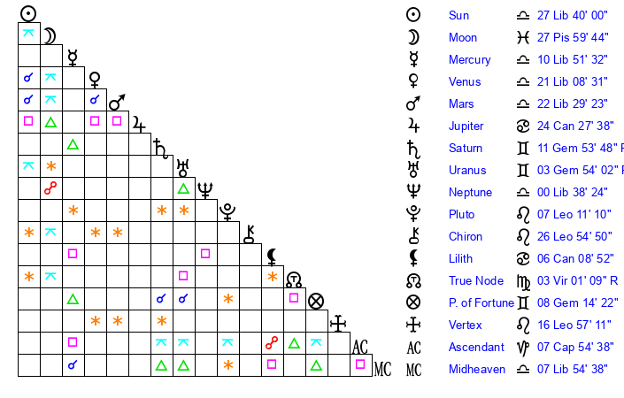 | Sun | 27 Libra 40 | 28 Libra 33 | 21 Capricorn 38 |