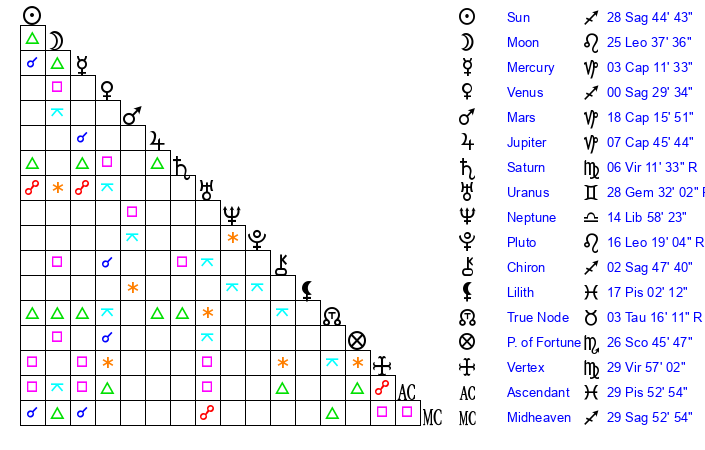 | Sun | 28 Sagittarius 45 | 29 Sagittarius 4 | 16 Pisces 48 |