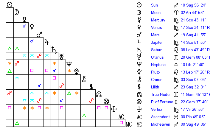 | Sun | 10 Sagittarius 56 | 11 Sagittarius 47 | 1 Pisces 13 |