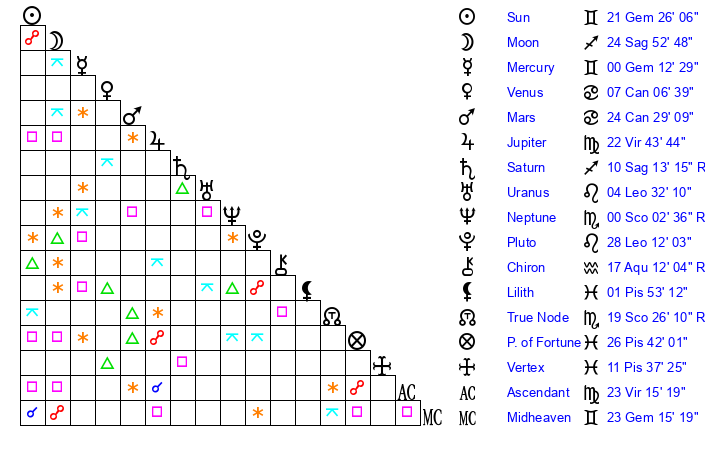 | Sun | 21 Gemini 26 | 21 Gemini 58 | 26 Leo 25 |