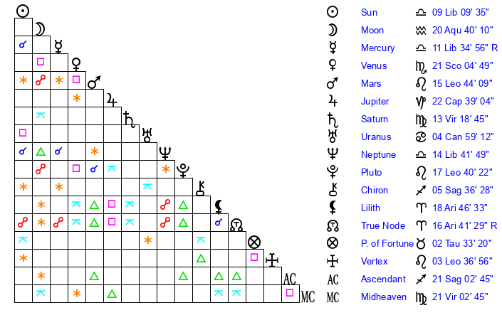 | Moon | 20 Aquarius 42 | 11 Aquarius 25 | 27 Scorpio 22 |