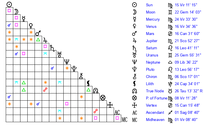 | Mercury | 24 Virgo 34 | 11 Virgo 53 | 13 Scorpio 22 |