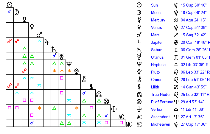 | Moon | 18 Capricorn 3 | 12 Aries 52 | 16 Capricorn 28 |
