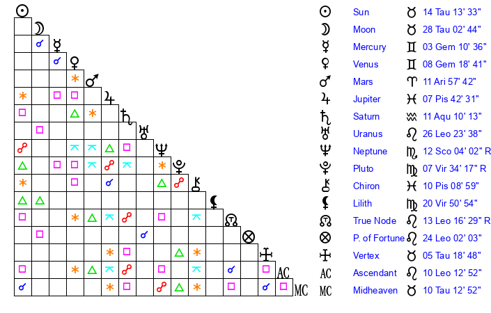 | Moon | 28 Taurus 4 | 22 Leo 28 | 14 Virgo 16 |