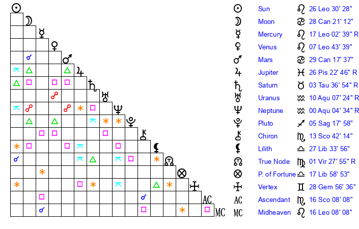 | Jupiter | 26 Pisces 28 | 15 Cancer 34 | 23 Pisces 12 |