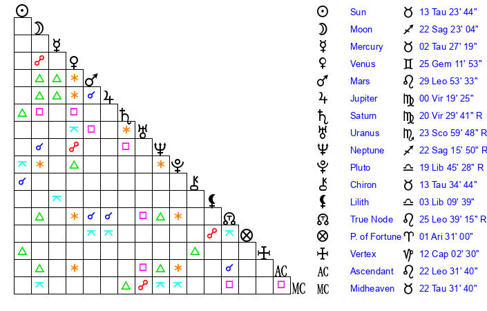 | Sun | 13 Taurus 24 | 13 Taurus 30 | 26 Gemini 38 |
