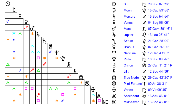| Sun | 29 Scorpio 7 | 29 Scorpio 53 | 3 Capricorn 38 |