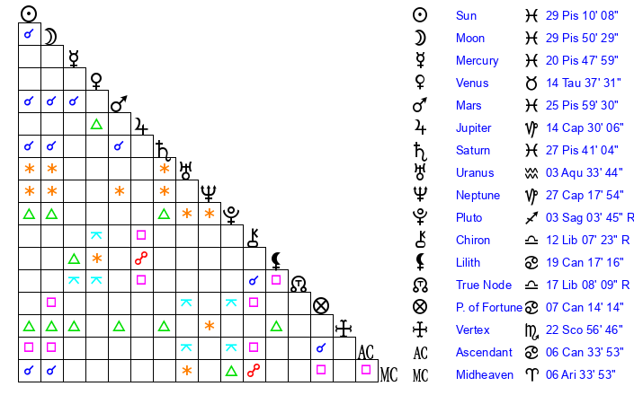 Sun | 29 Pisces 10 | 29 Pisces 8 | 27 Aries 45 |